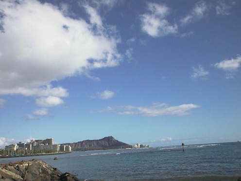 アラモアナビーチパークから、ダイアモンドヘッドと反対側のビーチを見る 高層ビル郡の前に、クリスタルウォーターの遠浅の海 ハワイは不思議だ・・ |