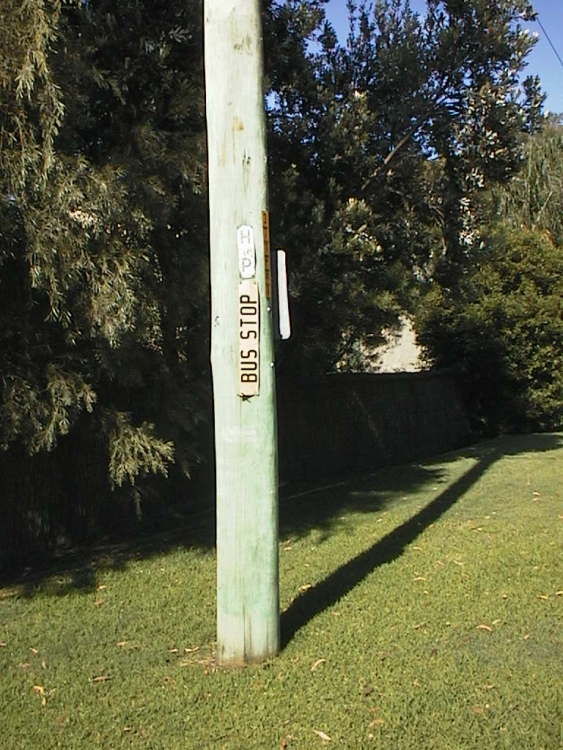 砂漠地帯から、人里に戻ってきました。 街中以外では、バス停は電信柱に印をつけただけのものになってしまう。 こういうおおらかな街が、旅をますます愛しいものにかえてくれる。 2000/11/25 NSW Australia