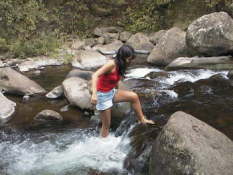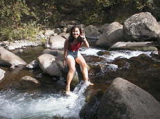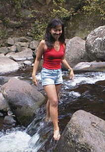 絶対すべり落ちるだろうと言われくやしくて川渡りにチャレンジ。 果たしてお約束通りすべって足ウラを切った(泣) それでもうれしそうな顔をしている私。 実はけっこう流血してタイヘンな足元ではあった。 2001/2/26 Hawaii