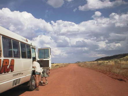 ツアーに参加した私を待っていたものは、乗っていた車両の故障だった・・ あわてるガイドと男性陣をよそに、写真撮影にいそしむ私たち 次の目的地まで車で4時間。延々と続く、赤土まるだしのラフロード・・・というのを 走り出した車の中で聞かされ、みんなの汗が冷たくなった。 2000/11/2 Central Australia