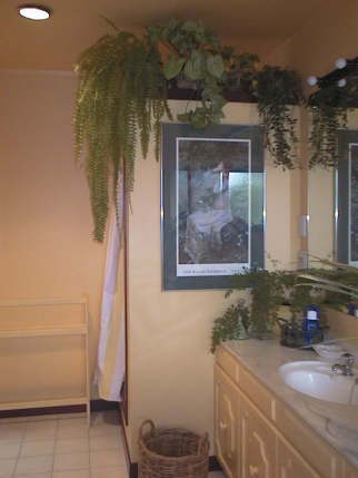 左は、観葉植物にあふれるバスルーム。
