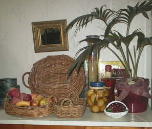 焼き立てのパンをいれるカゴが飾り物の様に並んでいるキッチンカウンター。