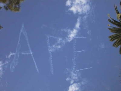 春の日溜りの中、浜辺を散歩中。ふと見上げた空に、飛行機雲で文字が残されていた。 判読できたのは、A・P・E・・・なんて描きながら飛んで行ったんだろう。 なんて平和な空なんだろう。 2000/10/26 Manly Australia