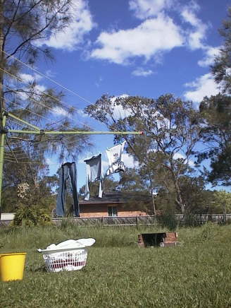 私の数少ない服たちが風に吹かれ、つかの間の休息中。